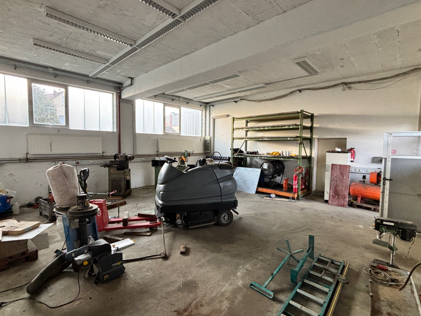 Das Gewerbegebäude erstreckt sich insgesamt über 3 Geschosse und wurde in massiver Bauweise auf einer Bodenplatte errichtet. Im Erdgeschoss befinden sich die Büroräumlichkeiten und Sanitärräume sowie eine Werkstatt und ein Materiallager mit einer Höhe von rund 4 Metern, die mit einem Roll- bzw. Falttor geöffnet und geschlossen werden können.