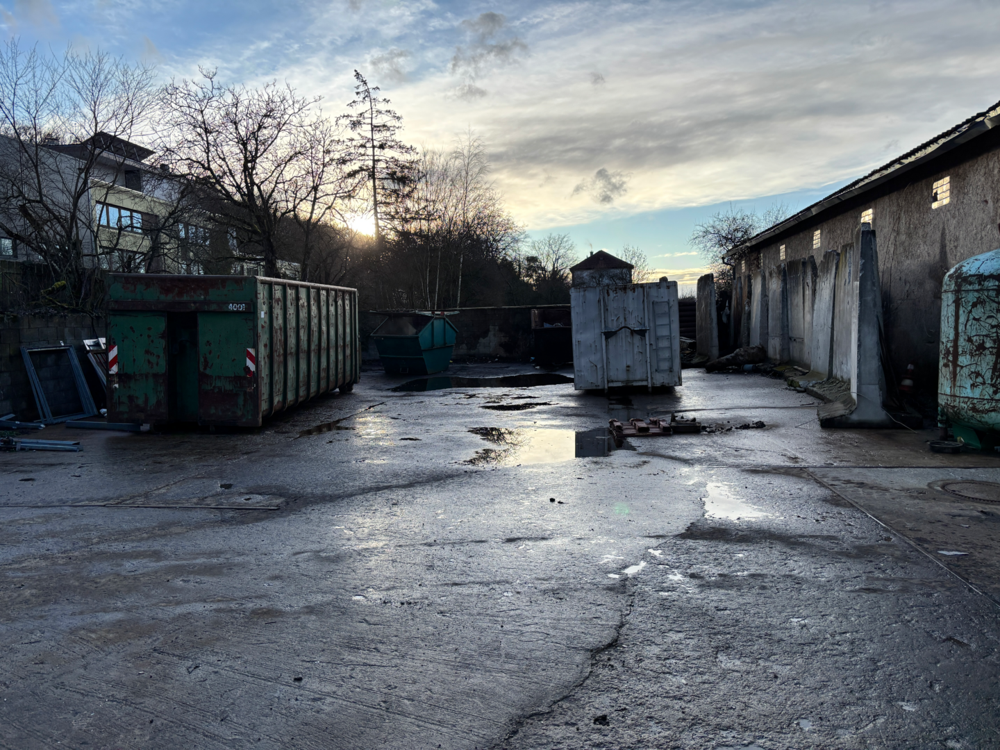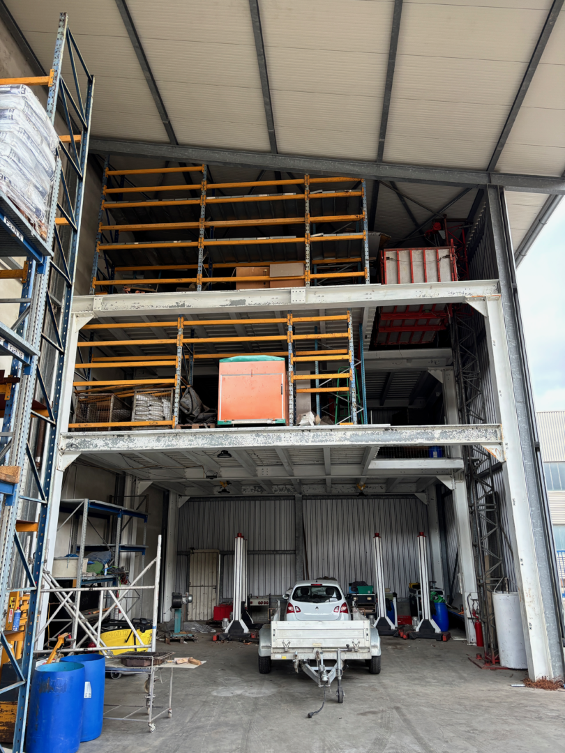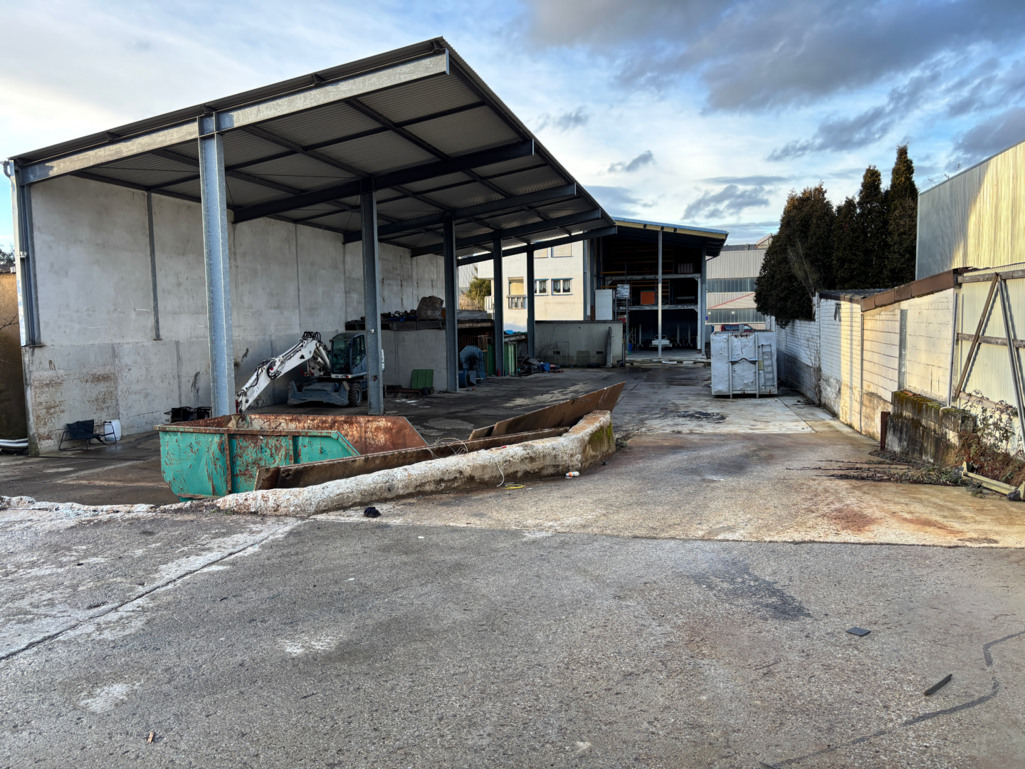 Nach Osten hin befindet sich eine überdachte Stahlkonstruktion am Gewerbegebäude, die insgesamt über 2 Zwischenebenen verfügt und als Lagerfläche dient. Das Dach der Stahlkonstruktion wurde Richtung Süden bis zum Ende des Gewerbegebäudes gezogen, sodass der Rest der Bodenplatte, worauf das Gebäude steht, überdacht ist. Auf dem Firmengelände befinden sich noch Stahlbleche, mit denen die Stahlkonstruktion geschlossen werden kann. Die Stahlbleche sind Bestandteil des Verkaufsangebots.