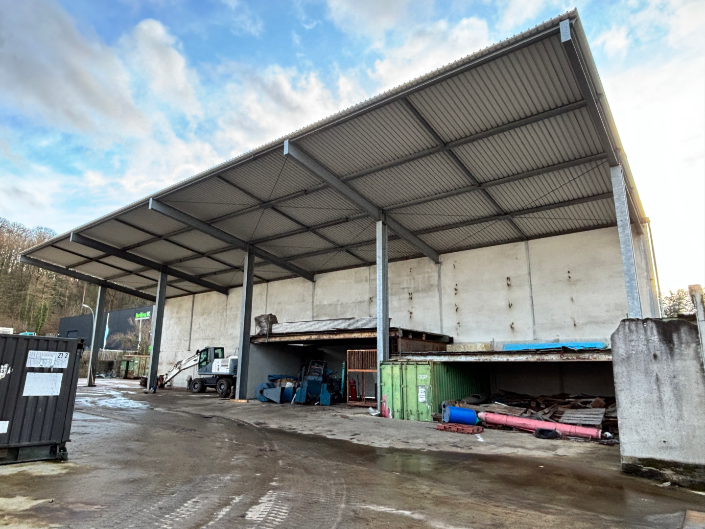 Richtung Süden befindet sich eine 10 Meter hohe, offene Überdachung, bestehend aus einer Feuerschutzwand und Stahlträgern. Überdacht ist eine Fläche von mehr als 300 Quadratmetern. In die Überdachung sind aktuell zwei Zwischenböden eingezogen worden. Weitere Zwischenböden können noch eingezogen werden, um weitere Nutzfläche oder Lagerfläche zu erschaffen.