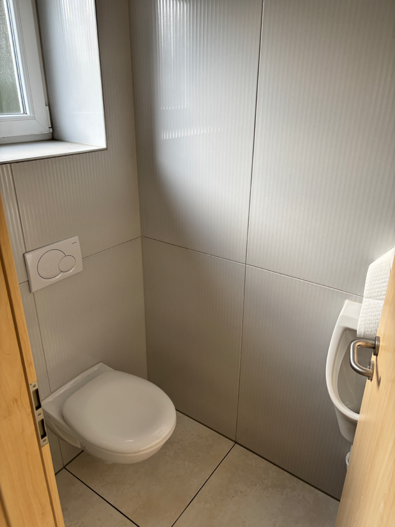 Das 1. Obergeschoss umfasst eine Wohnung mit rund 117,33 Quadratmetern inkl. Balkon, die vom Geschäftsführer oder von Betriebsangehörigen bewohnt werden darf. Gegenüberliegend von der Wohnung wurde eine Aufenthaltsmöglichkeit mit Bad, WC und Küche für Betriebsangehörige eingerichtet.